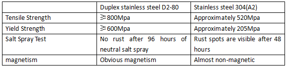 ডি 2-80 একটি দ্বৈত স্টেইনলেস স্টিল। "ডি 2" ডুপ্লেক্স স্টিল গ্রুপকে উপস্থাপন করে এবং "80" ন্যূনতম টেনসিল শক্তি 800 এন/মিমি ² নির্দেশ করে ² ডুপ্লেক্স স্টেইনলেস স্টিল ডি 2-80 স্ক্রুগুলি এসএস 304 স্ক্রুগুলির চেয়ে শক্তিশালী অ্যান্টি-লক থ্রেড সরবরাহ করে। ডি 2-80 এ 22% ক্রোমিয়াম সংযোজন 304 স্টেইনলেস স্টিলের চেয়ে একটি ডেনসার প্যাসিভ ফিল্ম তৈরি করে। প্রায় 50% অস্টেনাইট স্টেইনলেস স্টিল এবং 50% ফেরাইট দ্বারা গঠিত, ডি 2-80 উচ্চ শক্তি এবং জারা প্রতিরোধের সাথে অস্টেনিটিক স্টেইনলেস স্টিলের জারা প্রতিরোধের সংমিশ্রণ করে।
